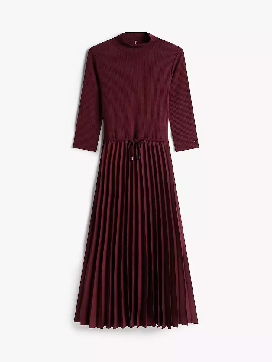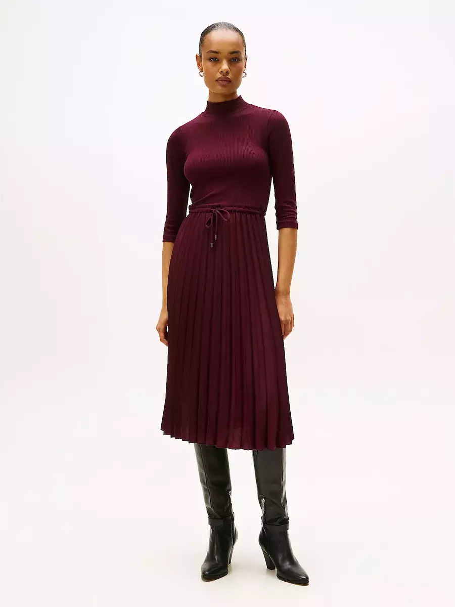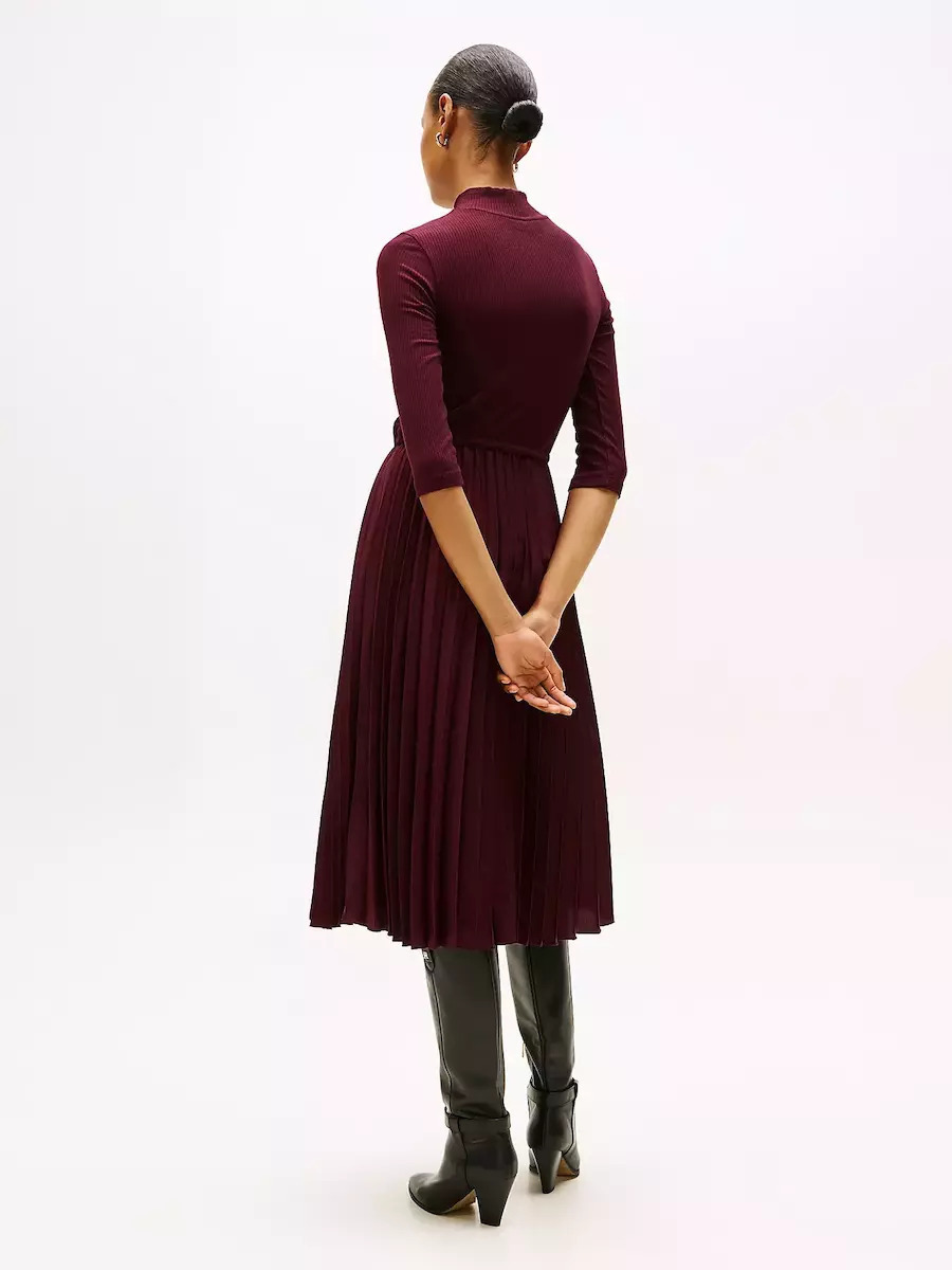 Απολαύστε αντιθετικές υφές σε αυτό το κολακευτικό Γυναικείο Φόρεμα Μπορντό Tommy Hilfiger WW0WW46138-XIH, με εφαρμοστό ριμπ τοπ και αέρινη πλισέ φούστα.