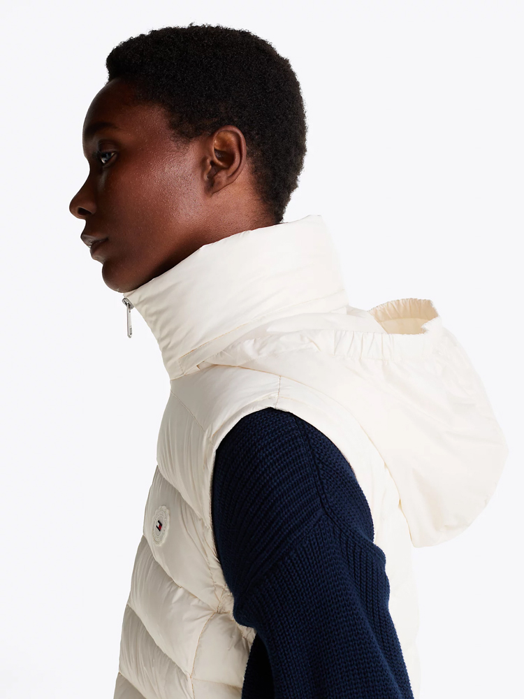 Αυτό το αδιάβροχο Γυναικείο Γιλέκο Εκρού Tommy Hilfiger WW0WW43773-Z00 είναι πρακτικό με street στιλ, διαθέτει συσκευαζόμενη κουκούλα και άνετη πουπουλένια γέμιση με γυαλιστερό φινίρισμα.