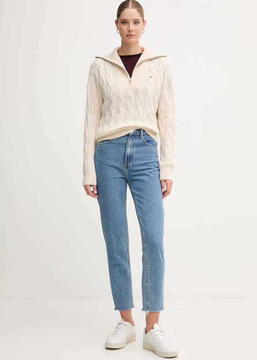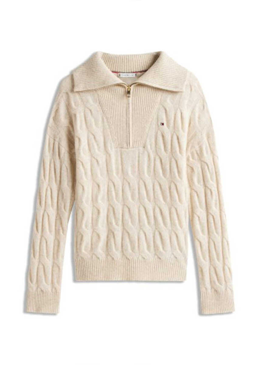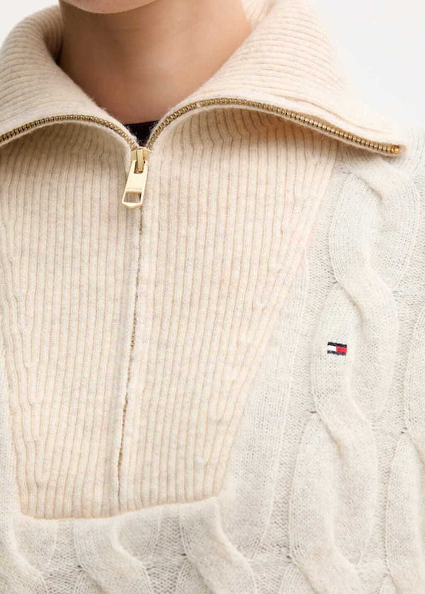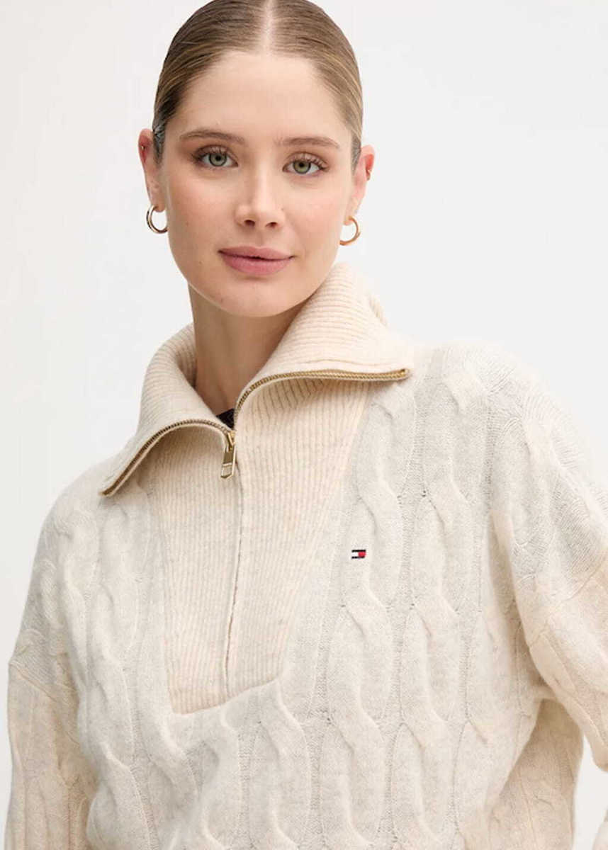 Ζεσταθείτε με αυτό το Γυναικείο Πουλόβερ Μπεζ Tommy Hilfiger WW0WW46425-ADK σε άνετη εφαρμογή, φτιαγμένο από 100% μαλλί σε παραδοσιακό σχέδιο με cable πλέξη και με μοντέρνο φερμουάρ στον λαιμό.