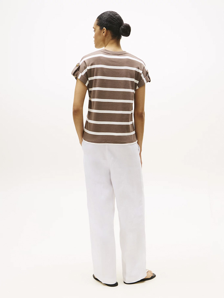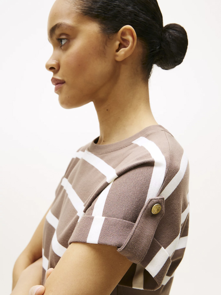 Η νέα PRE FW '25 collection της Tommy Hilfiger μόλις έφτασε! Αυτό το Γυναικείο T-shirt Καφέ Tommy Hilfiger WW0WW45628-0BL προσφέρει μια εμφάνιση εμπνευσμένη από το ναυτικό, με κολακευτική λαιμόκοψη και χρυσή λεπτομέρεια με κουμπί στοα μανίκια.