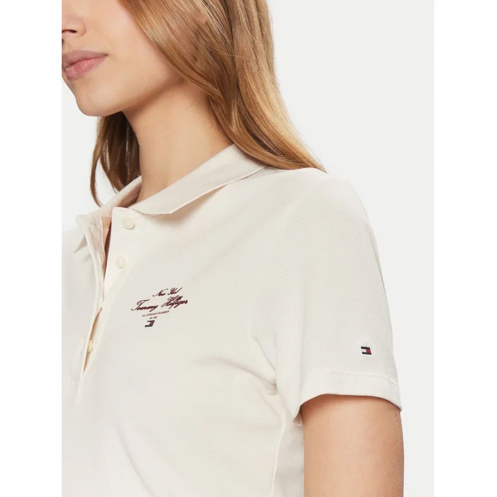Αυτό το Γυναικείο Slim Script Graphic Polo Μπεζ Tommy Hilfiger WW0WW43930-Z00 είναι φτιαγμένο από ελαστικό βαμβάκι και ξεχωρίζει χάρη στο λογότυπο στο στήθος.