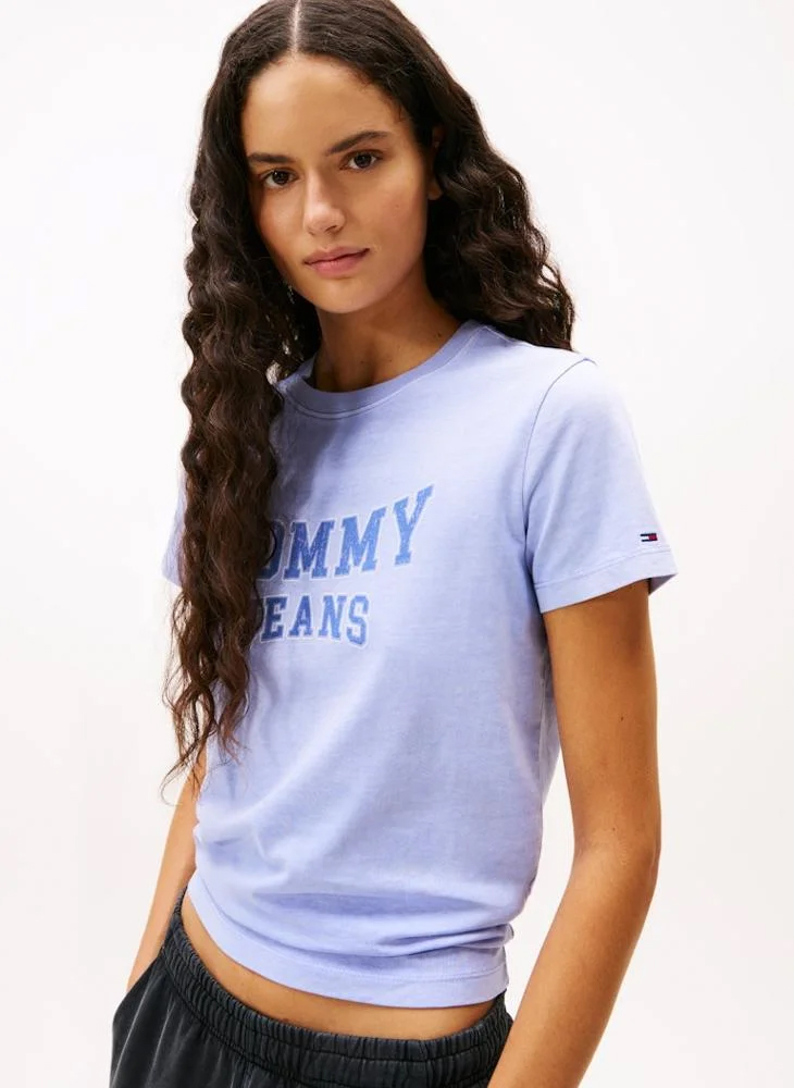 Αυτό το Γυναικείο T-shirt Μωβ Tommy Jeans DW0DW21966-C5Z από βαμβάκι με το ελαφρώς ξεθωριασμένο εφέ, ολοκληρώνεται με ένα κλασικό λογότυπο εμπνευσμένο από το varsity στιλ.