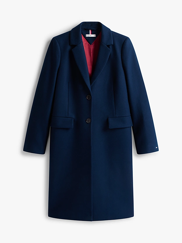 Αυτό το Γυναικείο Παλτό Navy Μπλε Tommy Hilfiger WW0WW46547-C1G με μονή σειρά κουμπιών από μείγμα μαλλιού έχει μια δόση κασμίρ στο ύφασμα, προσθέτοντας μια επιπλέον δόση πολυτέλειας στις εμφανίσεις για τον κρύο καιρό.