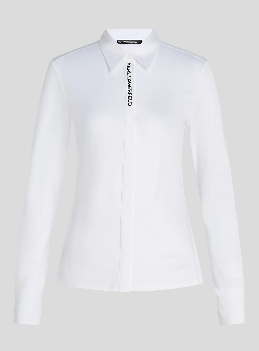 Για καθημερινές εμφανίσεις με στιλ, επιλέξτε αυτό το Γυναικείο Πουκάμισο Λευκό Karl Lagerfeld A3W17103-100 WHITE με το λογότυπο σην πατιλέτα για signature φινίρισμα.